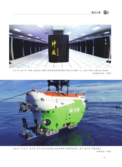 非凡十年 2016 年、2017 年,“神威·太湖之光”超级计算机连续获世界超级计算机 500 强第一名。图为“神威·太湖之光”机柜组 (滨湖区政府办 供图) 2020 年 7 月 22 日,“奋斗者”号以 10909 米的深度,创造中国载人深潜的新纪录。图为“奋斗者”号海试照片 (市科技局 供图) 33